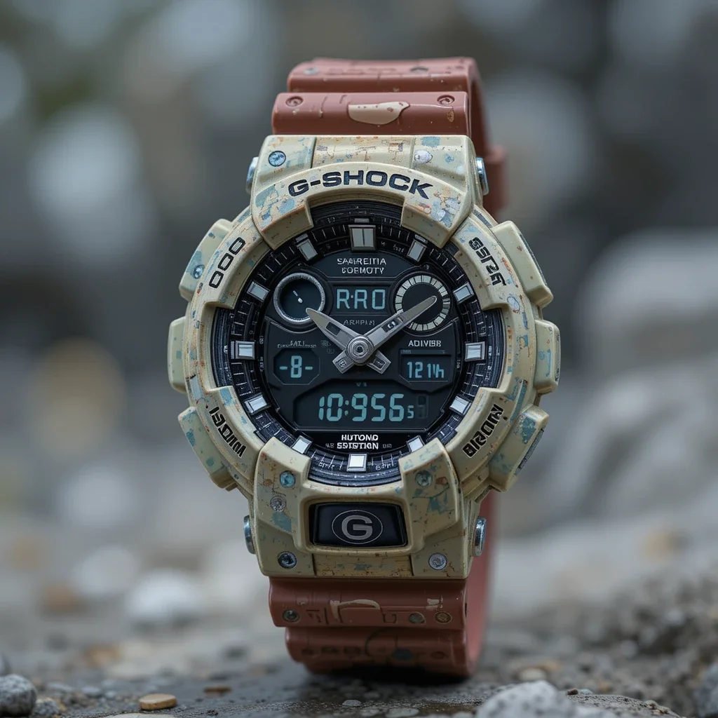 The G-Shock goes tactical. This model offers toughness with a stylish titanium camo look.